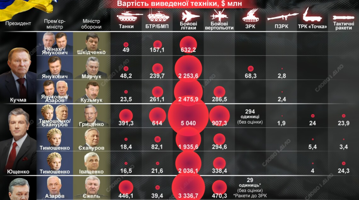 «Слово і діло» раніше вже аналізувало документ тимчасової слідчої комісії, з якого було видно, хто і скільки військової техніки вивів зі складу ЗСУ з 2004 до 2017 року. Цього разу – пропонуємо подивитися на ті самі дані в грошовому вимірі.