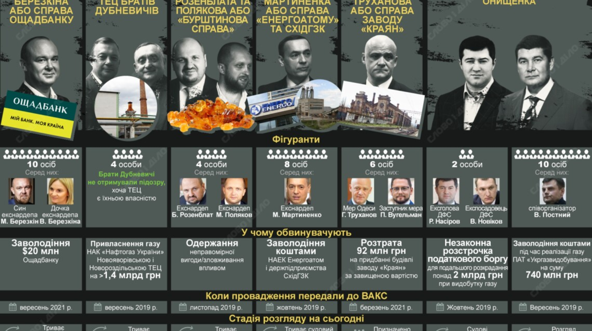 На розгляді Вищого антикорупційного суду станом на квітень перебувало понад 300 кримінальних проваджень, деякі з них надійшли до суду ще восени 2019 року – тобто відразу після початку його роботи. На інфографіці «Слово і діло» – приклади резонансних справ, які «зависли» у ВАКС.