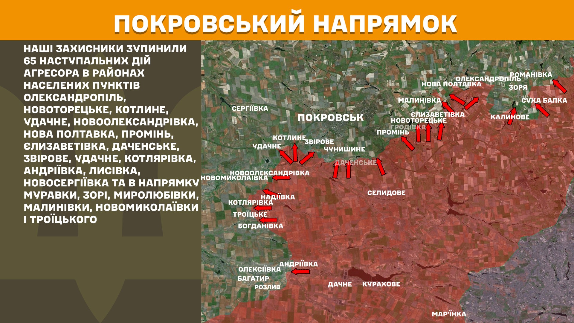 На Покровському напрямку захисники зупинили 65 наступальних дій агресора в районах населених пунктів Олександропіль, Новоторецьке, Котлине, Удачне, Новоолександрівка, Нова Полтавка, Промінь, Єлизаветівка, Даченське, Звірове, Удачне, Котлярівка, Андріївка, Лисівка, Новосергіївка та в напрямку Муравки, Зорі, Миролюбівки, Малинівки, Новомиколаївки і Троїцького.