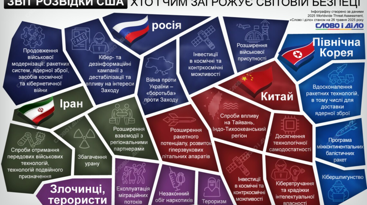 Країни-суперники США посилюють дії, що становлять загрозу глобальній безпеці. Йдеться про розвиток ракетних, ядерних, космічних і кібертехнологій, дестабілізаційні кампанії та регіональні конфлікти. Про це свідчить оновлена оцінка загроз американської розвідки — 2025 Worldwide Threat Assessment. «Слово і діло» проаналізувало документ і перераховує основні з них.