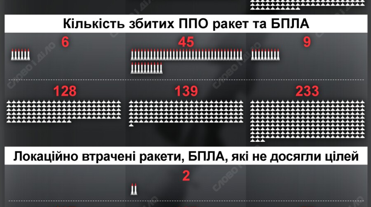 У ніч на 26 травня зафіксовано антирекорд — 355 БПЛА різних типів, з яких ППО збила 233. Росія також випустила 9 ракет, усі збито. Ураження зафіксовані у щонайменше 5 локаціях, щонайменше одна особа дістала поранення.