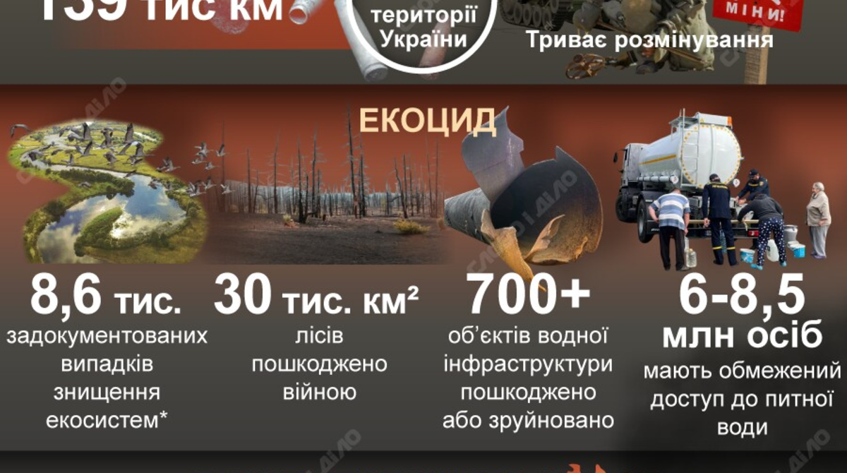 Екологічні збитки включають задокументовані 8,6 тисяч випадків знищення екосистем, ураження понад 30 тисяч кв. км лісових масивів, руйнування або пошкодження понад 700 об’єктів водної інфраструктури, а також обмеження доступу до питної води для 6-8,5 млн людей.