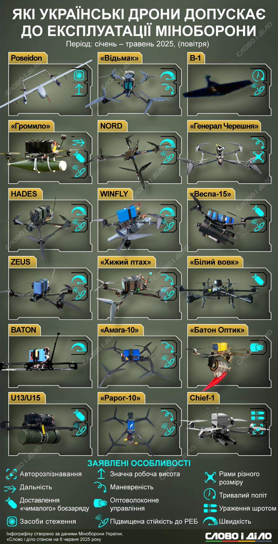 З початку 2025 року Міністерство оборони України офіційно допустило до експлуатації щонайменше 20 моделей українських безпілотників. Усі ці дрони вже серійно виробляються та застосовуються в бойових умовах. Про це свідчить аналіз повідомлень Міноборони, узагальнений «Слово і діло» станом на 6 червня 2025 року.
