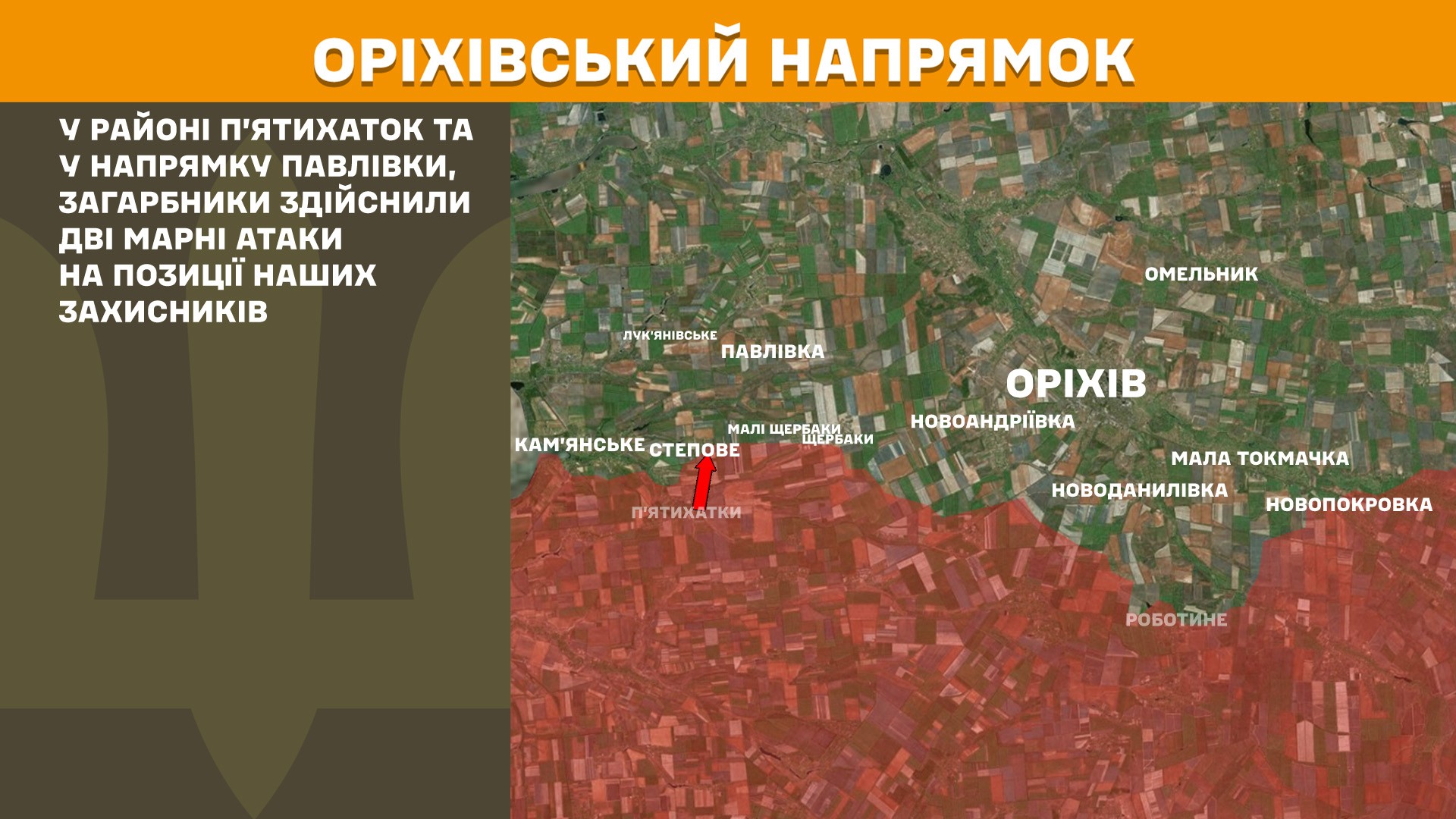 На Оріхівському напрямку загарбники здійснили 2 атаки у районі П’ятихаток та у напрямку Павлівки.