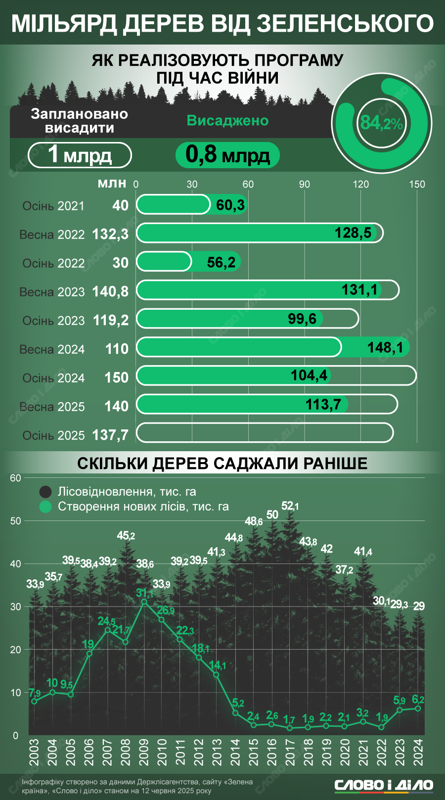 З 2021 року, коли президент Зеленський оголосив про мільярд дерев за 5 років, і до літа 2025 року в Україні висаджено 841,9 млн, що становить 84,2% від запланованого обсягу. Та навіть стовідсоткова реалізація програми не перевершила би попередніх темпів відновлення та створення нових лісів в Україні. Такого висновку дійшли аналітики «Слово і діло», дослідивши дані Держлісагентства з 2003 року до сьогодні.