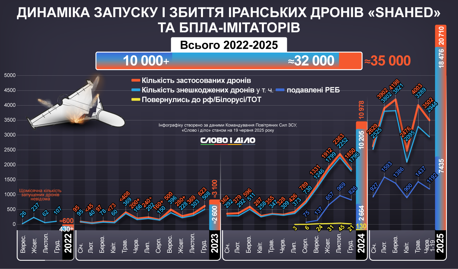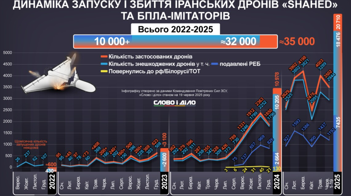 Станом на 19 червня з початку 2025 року рф здійснила 20 710 запусків дронів Shahed, імітаторів та інших типів БпЛА. З них 18 476 — були знешкоджені, що свідчить про високий показник ефективності перехоплення, 89%. Такого висновку дійшли аналітики «Слово і діло», дослідивши щоденні новини зі звітами командування Повітряних сил.