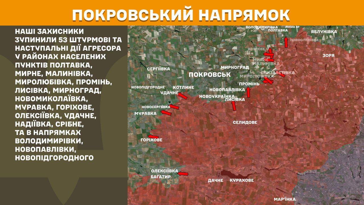 На Покровському напрямку українські воїни зупинили 53 штурмові й наступальні дії противника поблизу Полтавки, Мирного, Малинівки, Миролюбівки, Проміня, Лисівки, Мирнограда, Новомиколаївки, Муравки, Горіхового, Олексіївки, Удачного, Надіївки, Срібного, а також у напрямках Володимирівки, Новопавлівки та Новопідгородного.