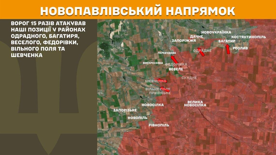 На Новопавлівському напрямку противник атакував 15 разів у районах Одрадного, Багатиря, Веселого, Федорівки, Вільного Поля та Шевченка.