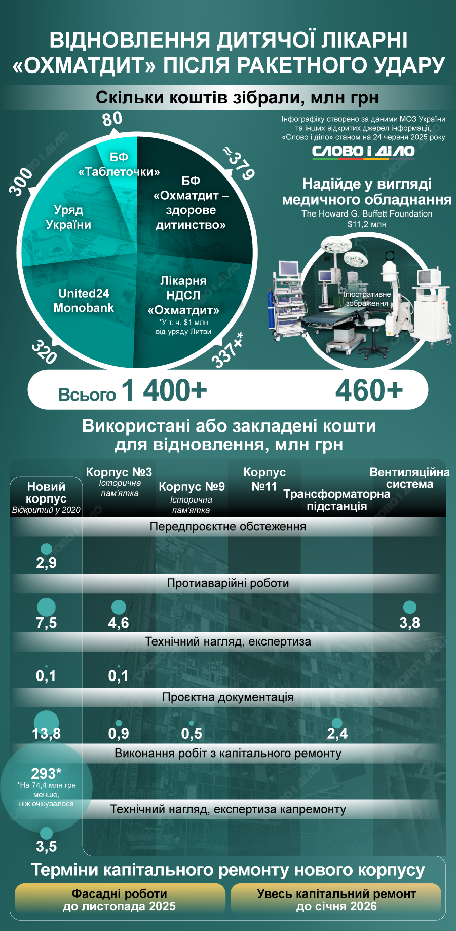 Незважаючи на понад 1,4 млрд грн зібраних коштів, капітальне відновлення дитячої лікарні «Охматдит» після минулорічного ракетного удару, за офіційними розрахунками, обходиться дешевше. Капітальний ремонт нового корпусу має закінчитися до січня 2026 року і коштуватиме близько 300 млн грн, а разом з попередніми протиаварійними роботами понад 320 млн грн. Такого висновку дійшли аналітики «Слово і діло», проаналізувавши відкриті дані МОЗ України.