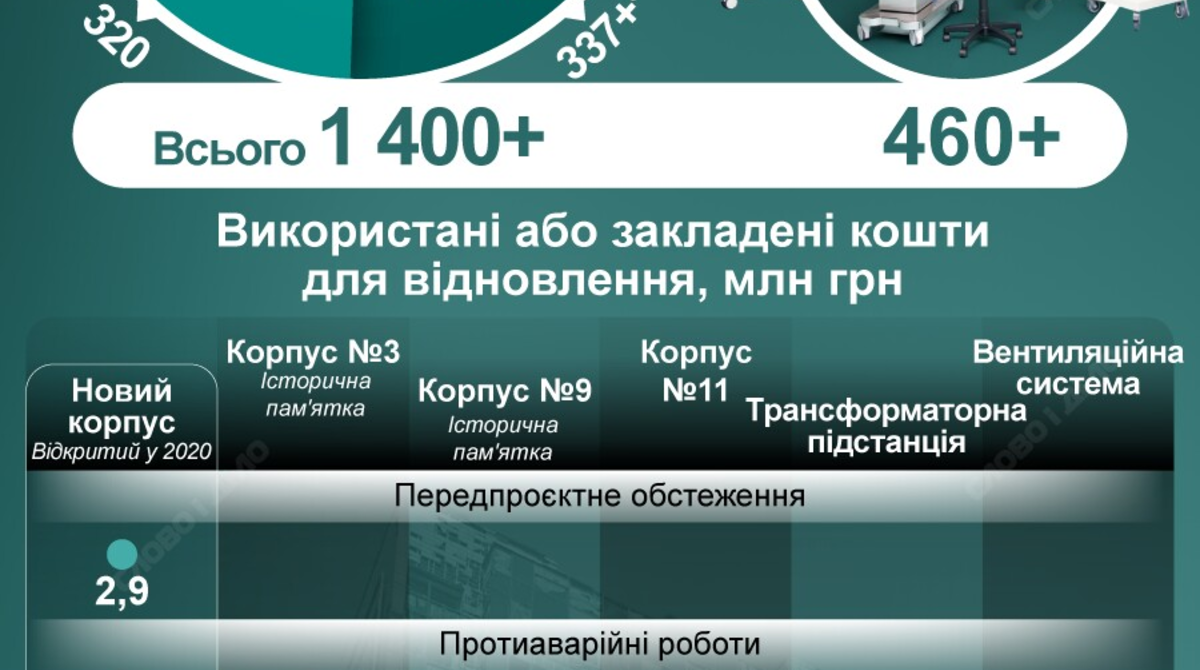Найбільші витрати вже закладено на новий корпус, відкритий у 2020 році. Зокрема, для виконання робіт з капремонту проведено тендер і укладено договір на 293 млн грн. На 74,4 млн грн менше, ніж очікувалося. Раніше кошти вже використовували на передпроєктне обстеження, протиаварійні роботи, технічний нагляд, документацію та експертизу.