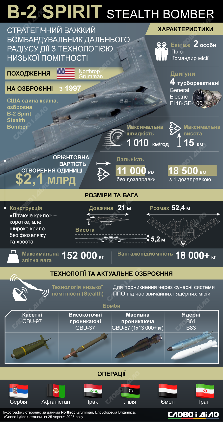 Цього місяця США провели масштабну повітряну операцію із застосуванням стелс-бомбардувальників B-2 Spirit. Саме ці літаки завдали ударів по цілях на території Ірану, зокрема по об’єктах, повʼязаних з ядерною програмою. «Слово і діло» дослідило, що відомо про ці бомбардувальники. Подробиці – на інфографіці.