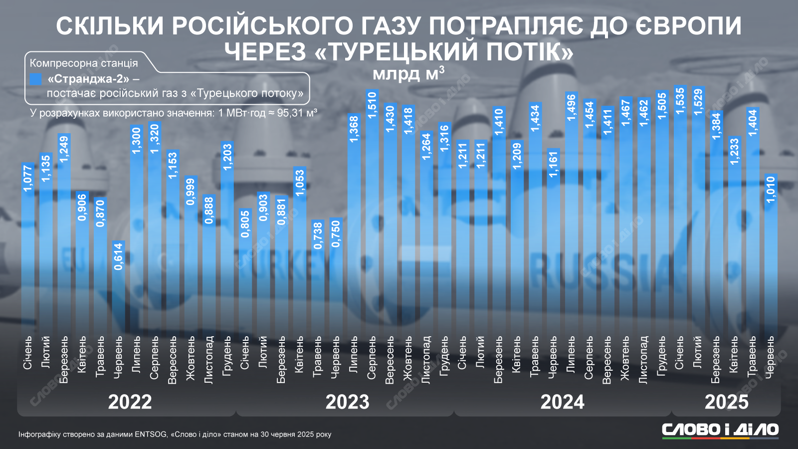 Згідно з офіційними даними ENTSOG, протягом січня–червня цього року через компресорну станцію «Странджа-2» у Болгарії до Європи було прокачано щонайменше 8,1 млрд м³ російського газу. Усі ці обсяги йдуть через «Турецький потік» — єдиний маршрут, який нині забезпечує системні постачання російського газу до Європи.