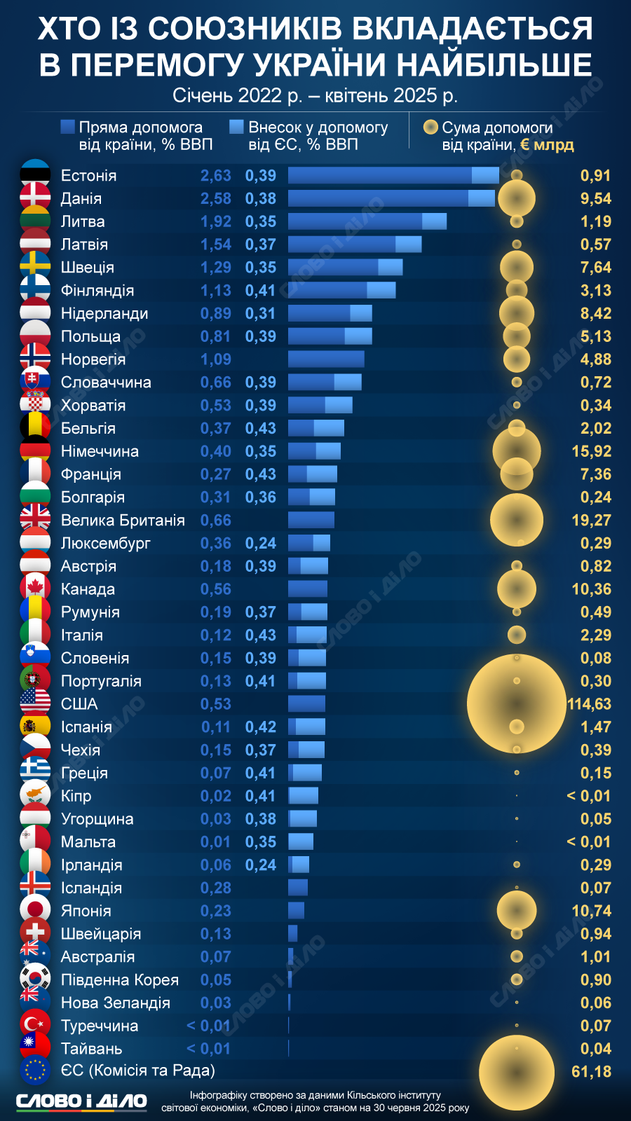 За понад три роки великої війни в Україні станом на кінець квітня 2025 року лідери за обсягами допомоги Україні залишилися незмінними – США, Велика Британія та Німеччина. Натомість найбільший відсоток зі свого бюджету віддають Естонія, Данія та Литва. Про це свідчать дані Кільського інституту світової економіки, досліджені «Слово і діло».
