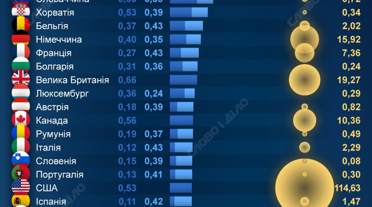 Водночас, країни Балтії, Скандинавії, як і раніше, вкладають найбільшу частку від власного ВВП — тобто несуть співмірно більший тягар, ніж великі економіки. У відсотках до ВВП список лідерів виглядає так: