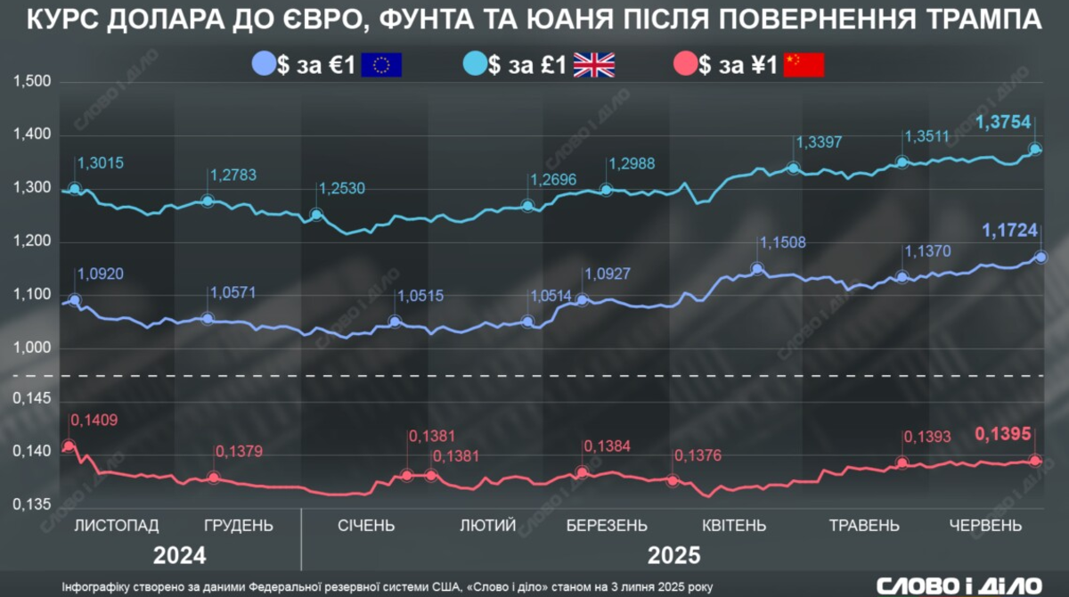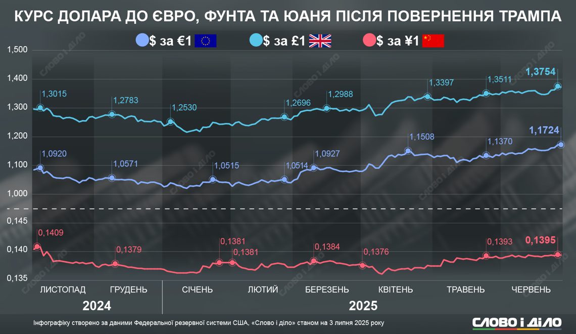 Фунт стерлінгів теж упевнено відіграє позиції. У листопаді 2024 року курс становив 1,28 долара за фунт. У червні 2025 – вже 1,37 долара. Найбільший стрибок зафіксовано у квітні, коли фунт подорожчав на 3 центи (з 1,30 до 1,33) протягом одного місяця. З листопада по червень загальне послаблення долара становить близько 8%.