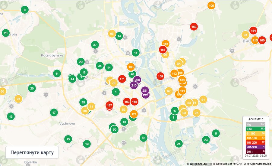 Станом на 07:00 4 линя 2025 року максимальний індекс якості атмосферного повітря становив 306. Це критичний показник. Якщо індекс досягає значення понад 300, то цей стан повітря є вкрай небезпечним для людей.