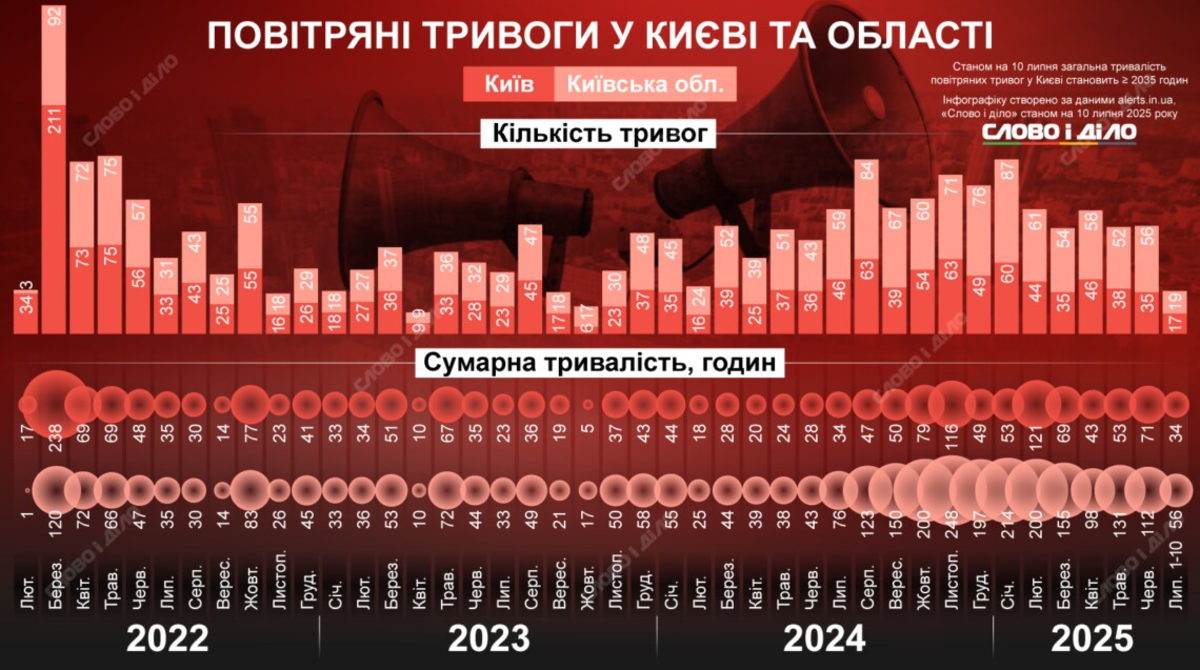 Загалом від лютого 2022 року до 10 липня 2025 року Київ пережив понад 1700 повітряних тривог загальною тривалістю щонайменше 2035 годин — це майже 85 діб безперервного сигналу.