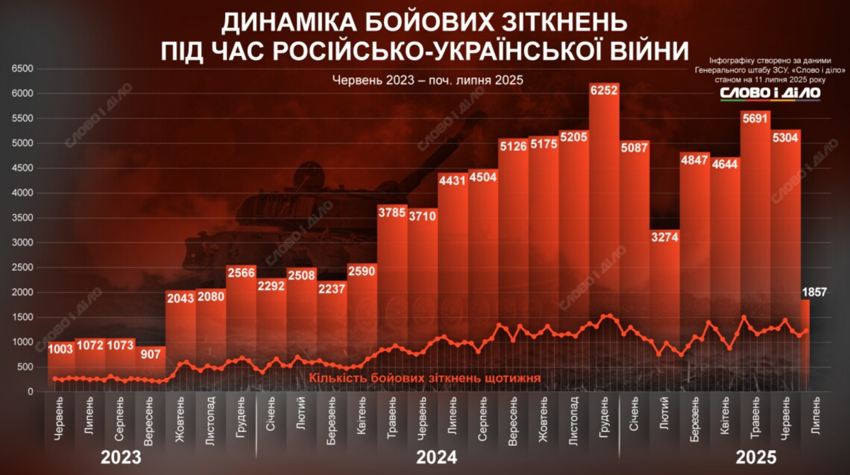 Західні ЗМІ вже називають літній наступ росіян 2025 року найбільш смертоносним з початку російсько-української війни, проте кількість бойових зіткнень, судячи зі зведень Генштабу, ще жодного разу не перевершила грудень 2024 року. Такого висновку дійшли аналітики «Слово і діло», проаналізувавши всі повідомлення Генерального штабу ЗСУ з червня 2023 року. Динаміка бойових зіткнень у період з червня 2023 року до початку липня 2025 року – на інфографіці.