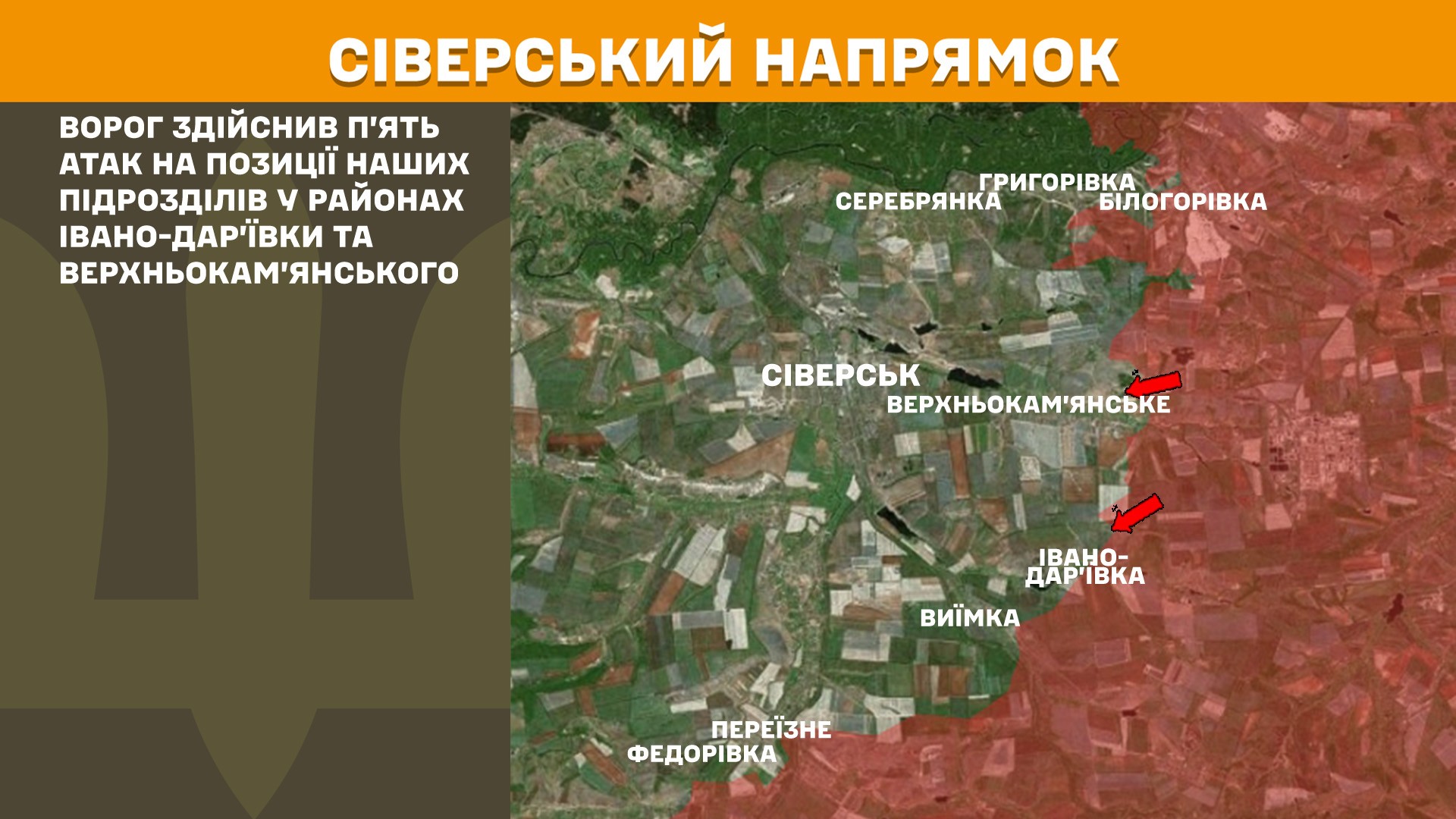 На Сіверському напрямку зафіксували 5 атак на позиції українських підрозділів у районах Івано-Дар’ївки та Верхньокам’янського.