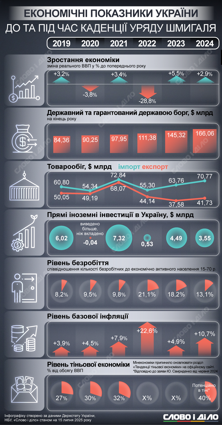 Востаннє Кабінет міністрів в Україні повністю змінювали через процедуру звільнення премʼєр-міністра ще перед пандемією Сovid-19. Денис Шмигаль, якому тепер пропонують посаду міністра оборони, став довгожителем на посаді очільника уряду, протримавшись на посаді понад 5 років. На тлі того, що крісло премʼєр-міністра тепер запропонували міністерці економіки, «Слово і діло» вирішило дослідити, як змінювалися основні економічні показники України протягом останніх років.