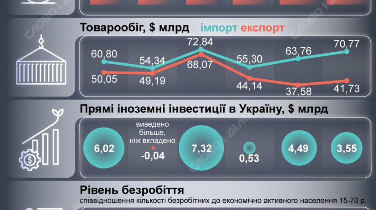 Після різкого падіння експорту у 2022 році ($44,14 млрд проти $68,07 млрд у 2021), у 2024 він не досягнув навіть довоєнного рівня і становить $41,73 млрд. Імпорт відновлюється: з $55,30 млрд у 2022 до $70,77 млрд у 2024 році – але все ще менше, ніж у 2021-му.