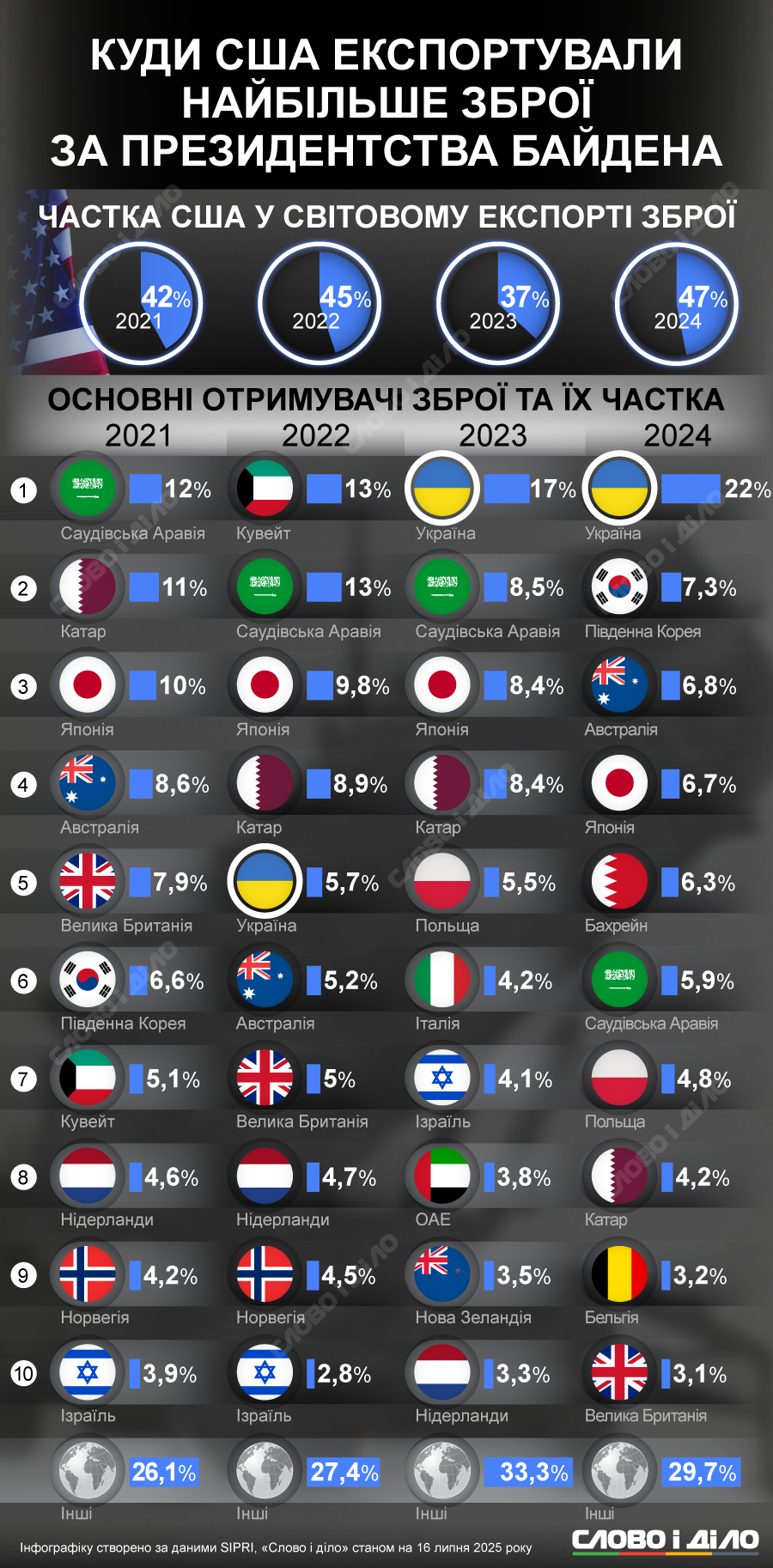Хоча частка США у світовому експорті зброї коливається, країна зберігає безумовне лідерство. У 2021 році на Штати припадало 42% світового експорту, у 2022 – 45%, у 2023 – частка скоротилася до 37%, але у 2024 – знову зростання до 47%.