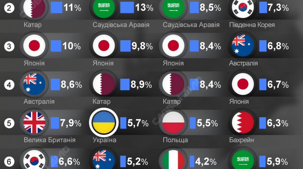 - Катар: з 11% у 2021 році до 4,2% у 2024.