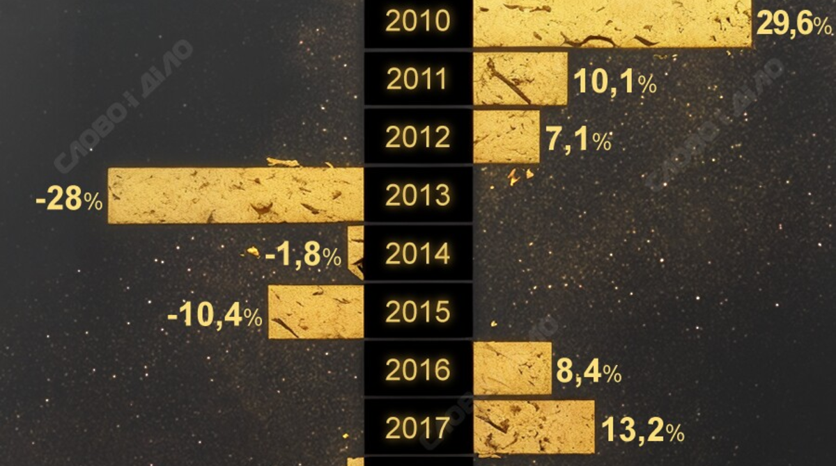 Водночас у 2013–2015 роках спостерігалося тривале падіння: на 28% у 2013 році, 1,8% – у 2014-му та 10,4% – у 2015-му. Після цього ринок відновився – з 2016 до 2020-го року прибутковість жовтого металу зростала, включно з піковим результатом (+25,1%) у 2020-му. Виняток 2018 рік (-1,6%).