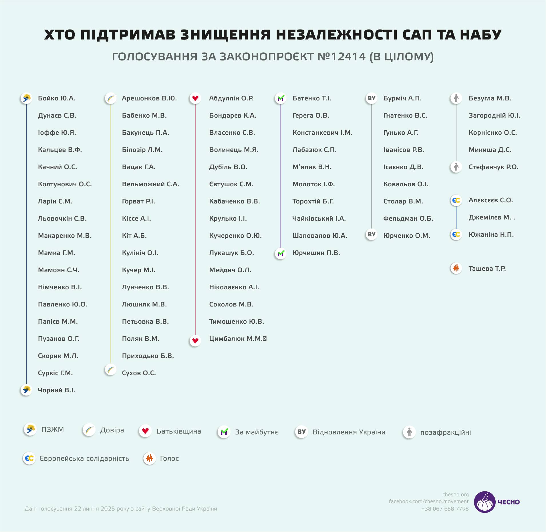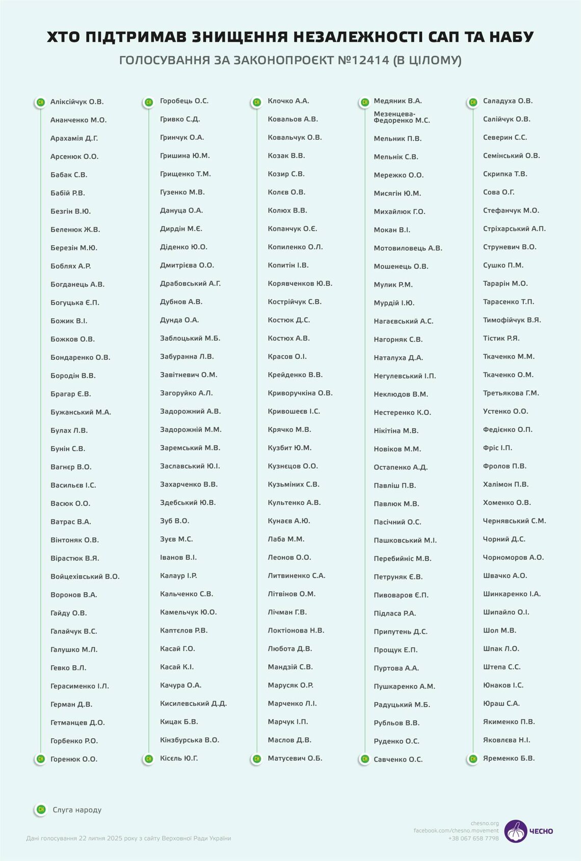 Оприлюднено повний перелік з 263 народних депутатів, які сьогодні, 22 липня, підтримали законопроєкт №12414 з положеннями, що фактично ліквідовують незалежність САП та НАБУ.