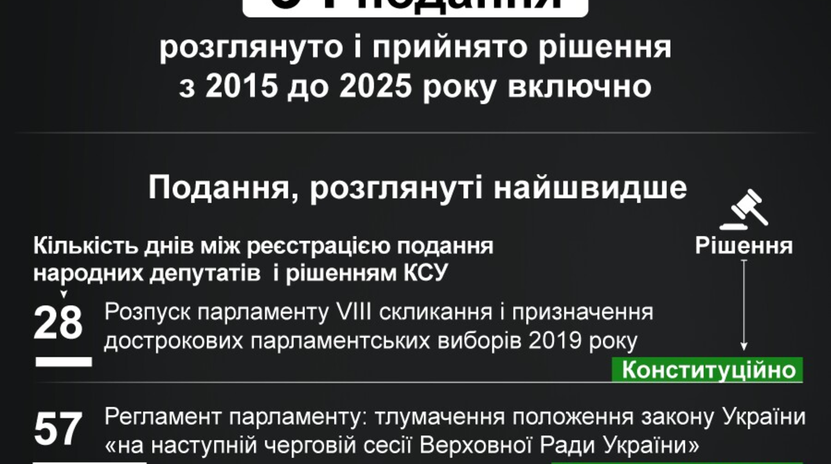 Від моменту подання народних депутатів до Конституційного суду України до винесення рішення суддями проходить у середньому 753 дні – тобто, трохи більше 2 років. Водночас, як показує практика, справи, що стосуються діяльності антикорупційних органів, розглядаються найоперативніше. Такого висновку дійшли аналітики «Слово і діло», проаналізувавши тривалість розгляду всіх подань, що отримали рішення КСУ з 2015 до 2025 року.