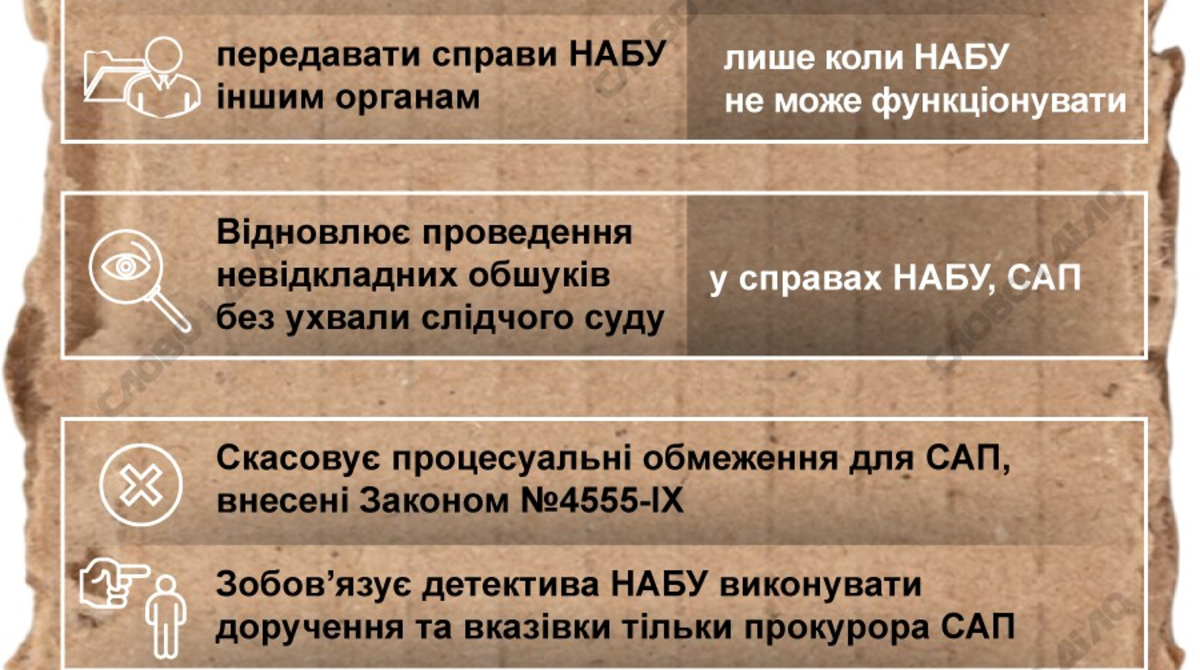 Передусім законопроєкт скасовує процесуальні обмеження для Спеціалізованої антикорупційної прокуратури (САП), внесені Законом №4555-ІХ та захищає справи Національного антикорупційного бюро (НАБУ) від втручання інших органів, зобовʼязуючи детективів НАБУ виконувати доручення та вказівки лише прокурора САП.