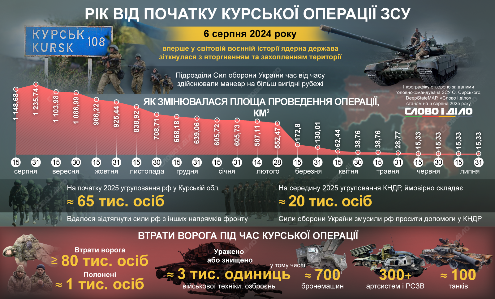 Рік тому – 6 серпня 2024 року – Сили оборони України розпочали наступальну операцію на території Курської області російської федерації. Захисники України не залишилися в так званій глухій обороні, а поєднали оборону з ефективними наступальними діями. Це стало першим випадком у воєнній історії, коли ядерна держава зазнала вторгнення з втратою контролю над частиною власної території. За даними DeepStateMAP і головнокомандувача ЗСУ Олександра Сирського, на піку операції – 31 серпня – українські війська контролювали 1 235,74 км². Детальніше про річні підсумки операції – на інфографіці «Слово і діло».
