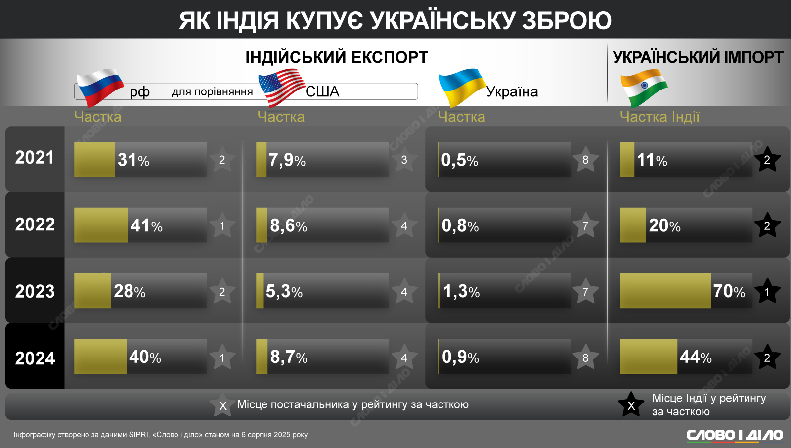 З очевидних причин велика частка проданого Україною озброєння не дорівнює великій кількості, адже обсяги продажів зброї, через потребу захищатися, є надзвичайно малими. Таким чином за даними SIPRI, у 2023 році українська частка становила лише 1,3% озброєння, купленого Делі, а у 2024 – 0,9%. Для порівняння, частка рф у постачаннях озброєння в Індію у 2024 році сягала 40%, що забезпечило росії перше місце у рейтингу.