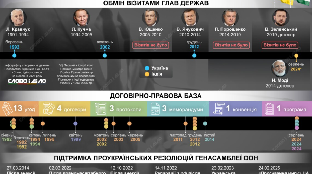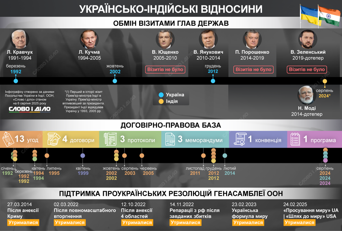 З індійського боку ситуація виглядала ще більш стриманою – аж до серпня 2024 року, коли прем’єр-міністр Нарендра Моді здійснив перший в історії офіційний візит до України. Цей жест виглядав символічним, але не супроводжувався кардинальними змінами в політичній чи економічній підтримці, було підписано декілька меморандумів та угоду про співпрацю у галузях сільського господарства та харчової промисловості.