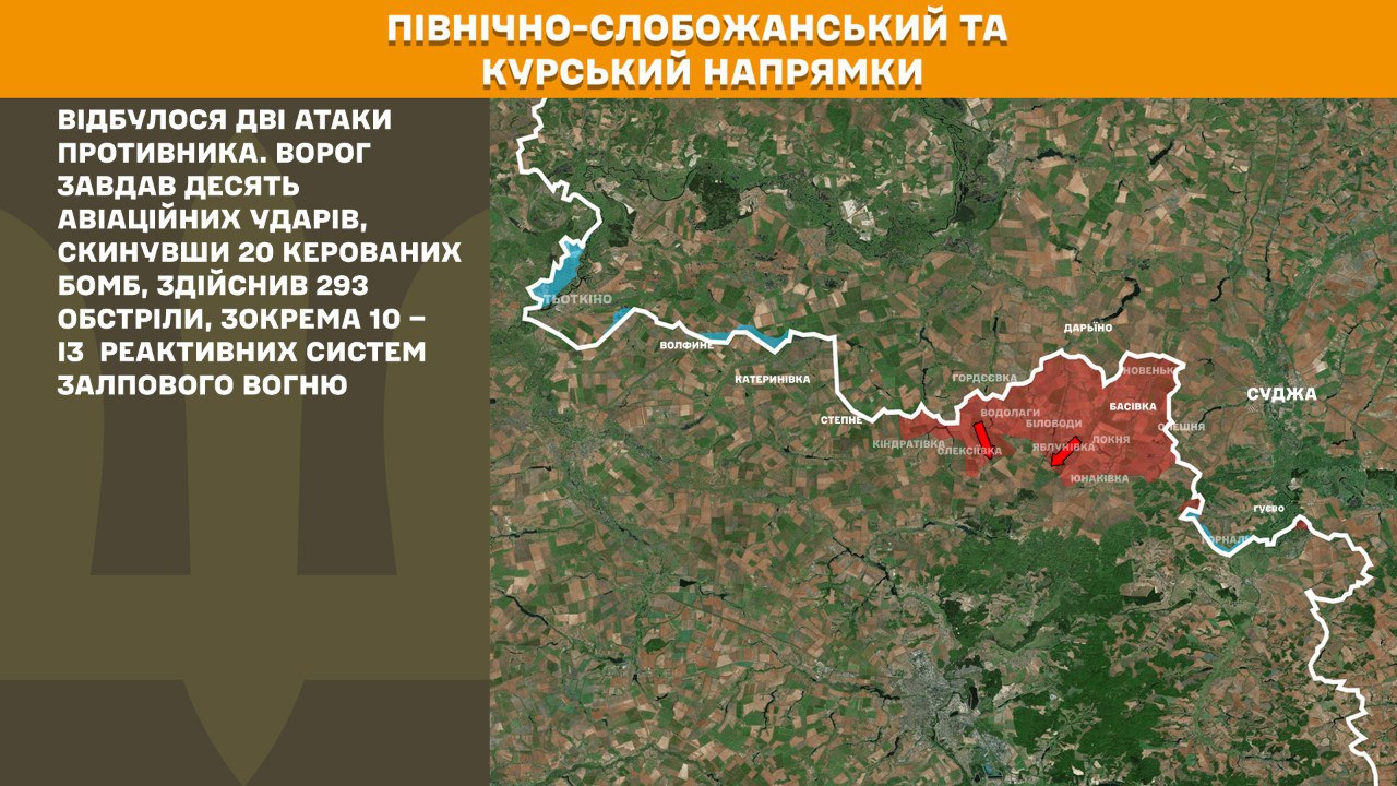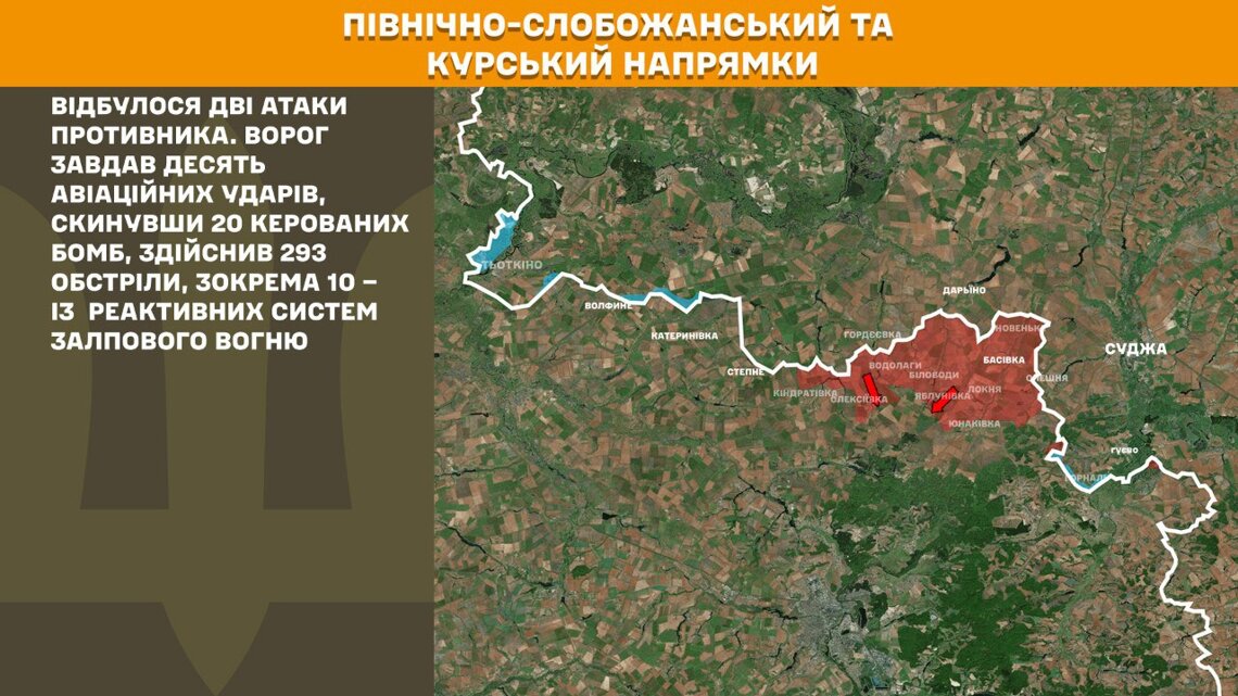 На Північно-Слобожанському і Курському напрямках відбулося дві атаки противника. Ворог завдав десять авіаційних ударів, скинувши 20 керованих бомб, здійснив 293 обстріли, зокрема 10 – із реактивних систем залпового вогню.