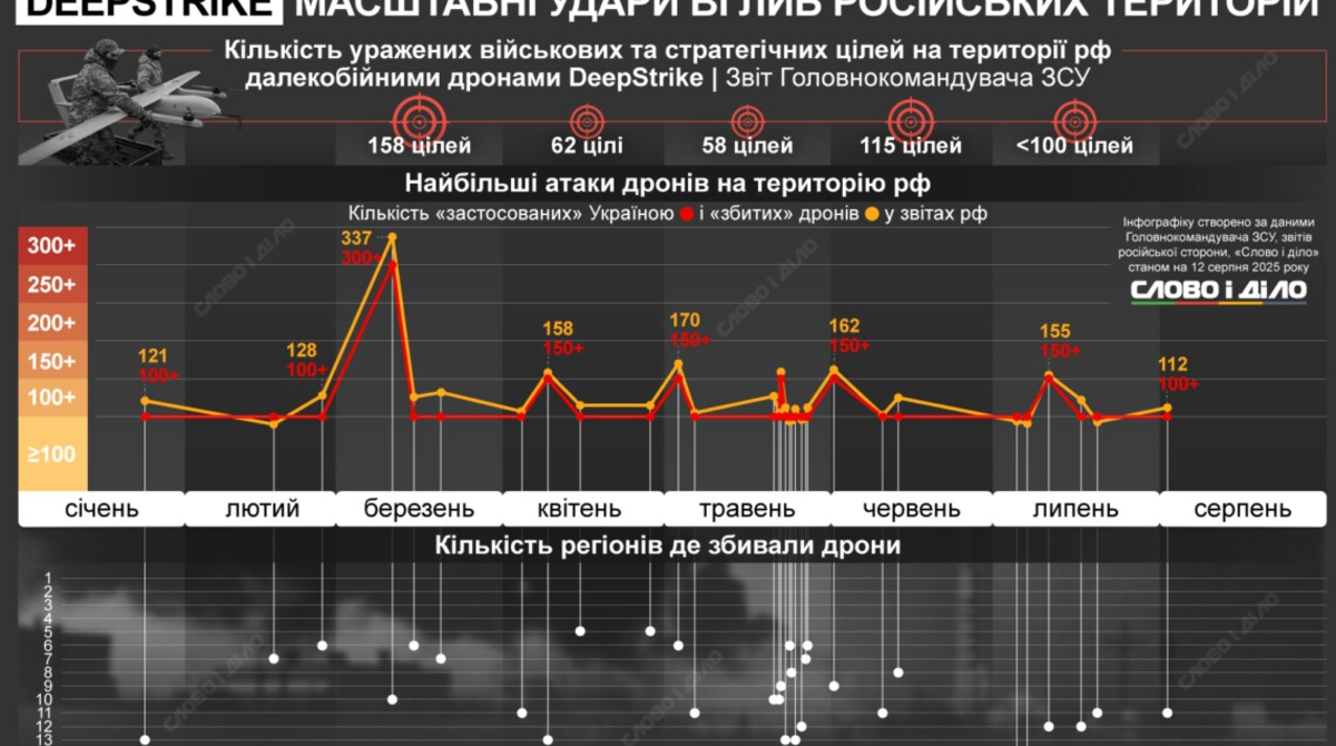 Згідно з даними головнокомандувача ЗСУ Олександра Сирського, від початку року найбільше військових та стратегічних цілей на території рф далекобійні дрони DeepStrike уразили в березні – 158 цілей. У червні українські дрони атакували 115 ворожих об'єктів, у липні – 100. У квітні було уражено на території рф 62 цілі, у травні – 58.