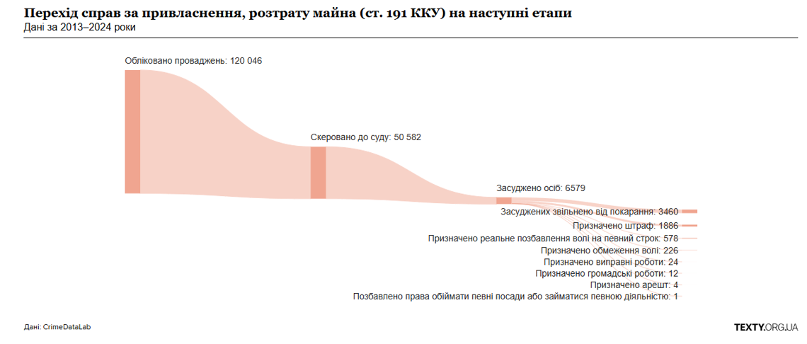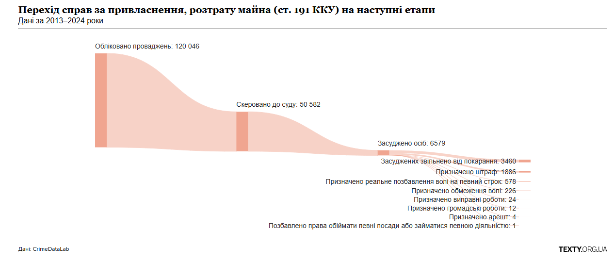 За останні 12 років (з 2013 року) в Україні відкрили понад 120 тисяч проваджень за статтею 191 КК «Привласнення, розтрата майна або заволодіння ним шляхом зловживання службовим становищем», однак реальне покарання у вигляді позбавлення волі отримали менше 600 осіб.