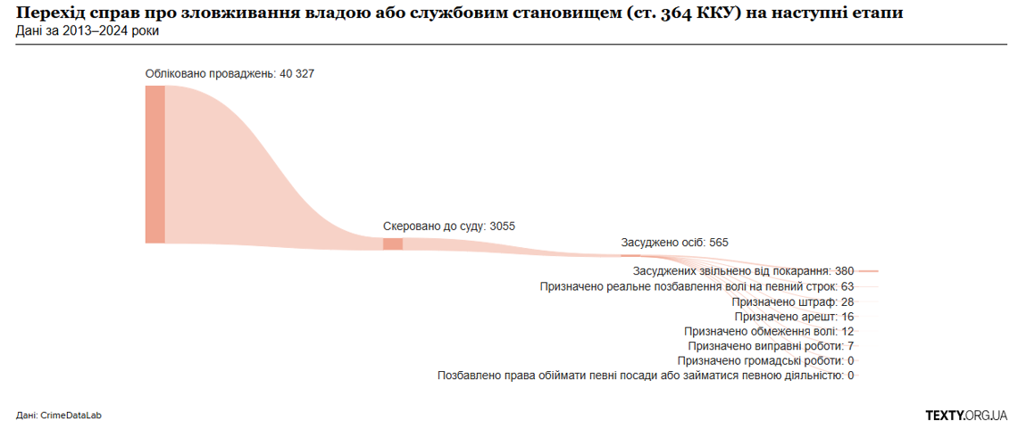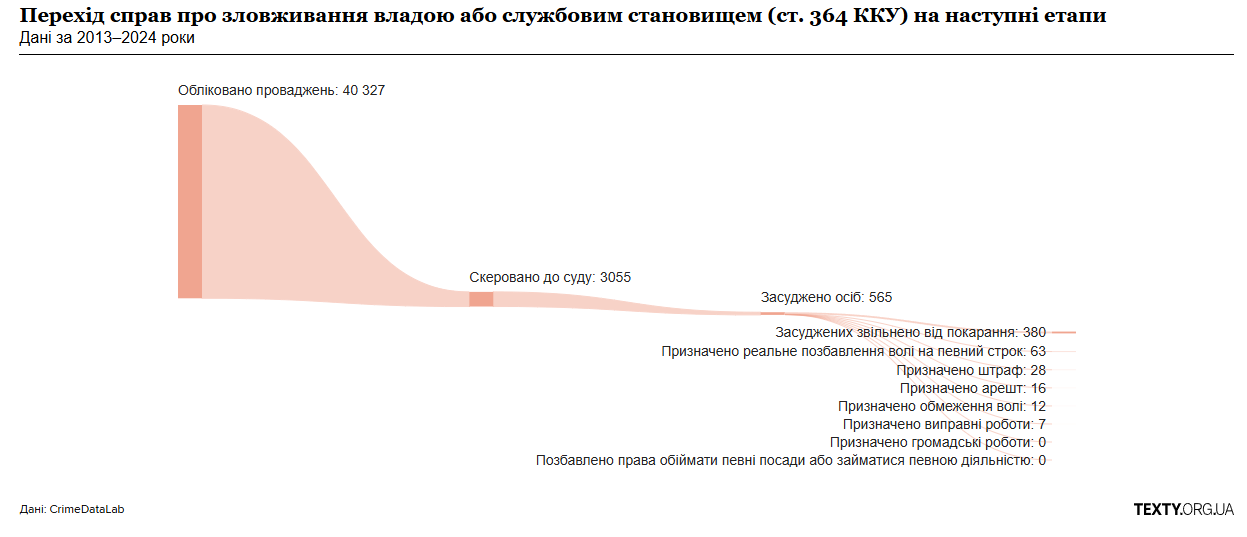 Як зазначається, ще гірша ситуація зі статтею 364 («Зловживання владою або службовим становищем»). З понад 40 тисяч проваджень до суду потрапляють лише 10% – лише 3 тисячі. Реальне позбавлення волі отримали всього 63 особи за весь період.