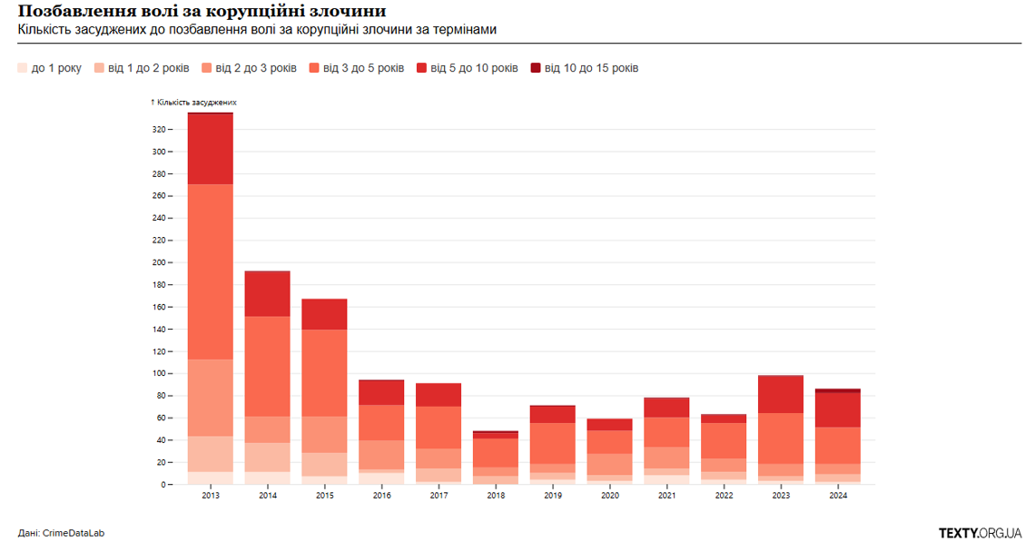 Однак загальна кількість засуджених до увʼязнення за всіма корупційними статтями за рік становить менш як 100 осіб.