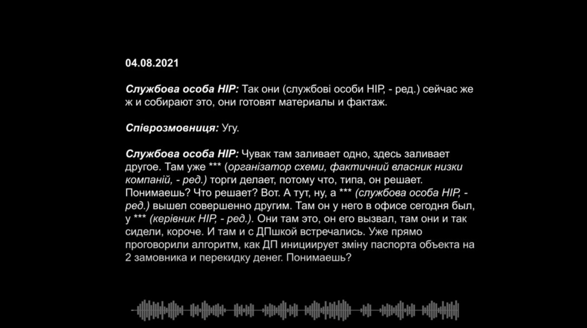 «Чувак там заливає одне, тут заливає інше. Там вже (Фісталь - ред.) торги робить, тому що, типу, він вирішує. Розумієш? Що вирішує? Ось. А тут, ну, а (службова особа HIP, - ред.) вийшов зовсім іншим. Там він у нього в офісі сьогодні був, у (керівника HIP, Андрія Шипка - ред.). Вони там це, він його викликав, там вони й так сиділи, коротше. І там і з ДПшкою зустрічались. Вже прямо проговорили алгоритм, як ДП ініцією зміну паспорта об'єкту на 2 замовника і перекидування грошей. Розумієш?», – йдеться в одній з розмов.