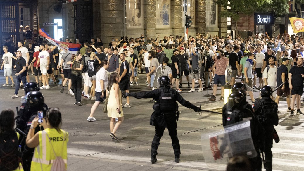 У столиці Белграді поліція в повному спорядженні для придушення масових заворушень не дозволила антиурядовим протестувальникам наблизитися до парку біля будівлі парламенту, де з березня розташовані табори прихильників Вучича. В інших районах Белграда демонстранти зіткнулися з поліцією, яка не пропустили їх до місцевих офісів SNS.