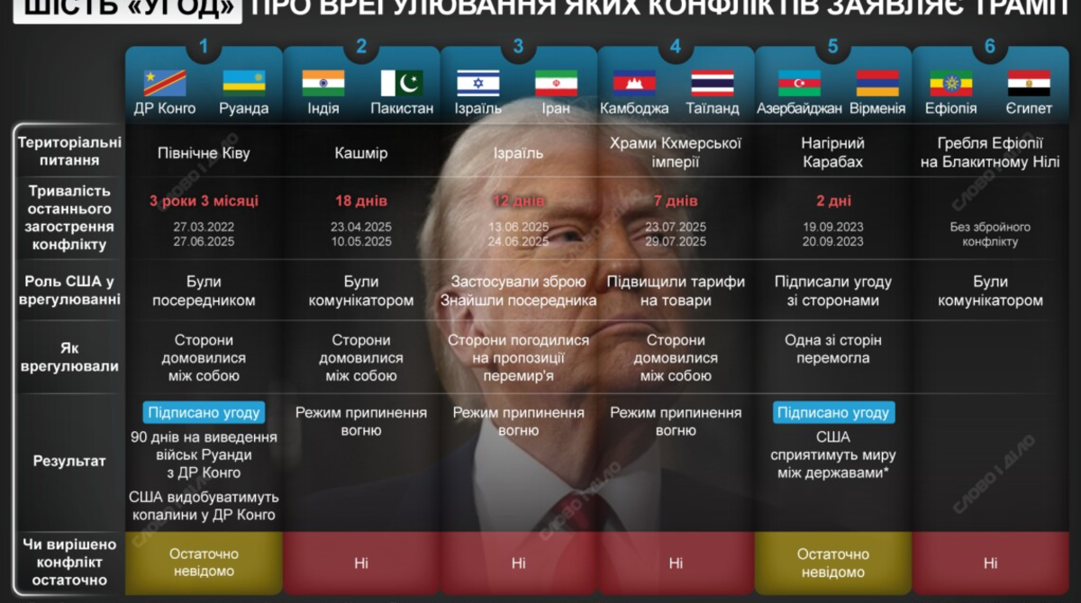 Попри висунення президента США Дональда Трампа на Нобелівську премію миру за його роль у вирішенні світових збройних конфліктів, президент США сподівається поповнити «свій список перемог» завершенням війни в Україні. Раніше Трамп помилково очікував, що завершення російсько-української війни він зможе досягти найшвидше. «Слово і діло» розбиралося, що насправді стоїть за укладеними раніше угодами, якими хизується Трамп, кого саме і як він примирив та чи вдалося йому досягти стійкого миру.