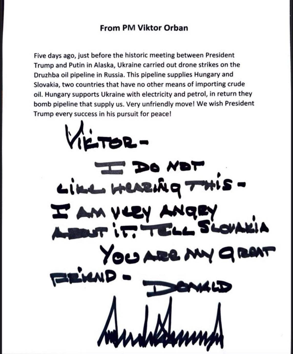 Газета оприлюднила копії листа Орбана та відповіді Трампа. У своєму зверненні угорський прем’єр підкреслив, що «Дружба» є єдиним джерелом імпорту нафти для обох країн. Орбан зазначив, що Угорщина підтримує Україну постачанням бензину та електроенергії, однак у відповідь Київ атакує критичну енергетичну інфраструктуру, яка забезпечує Угорщину та Словаччину.