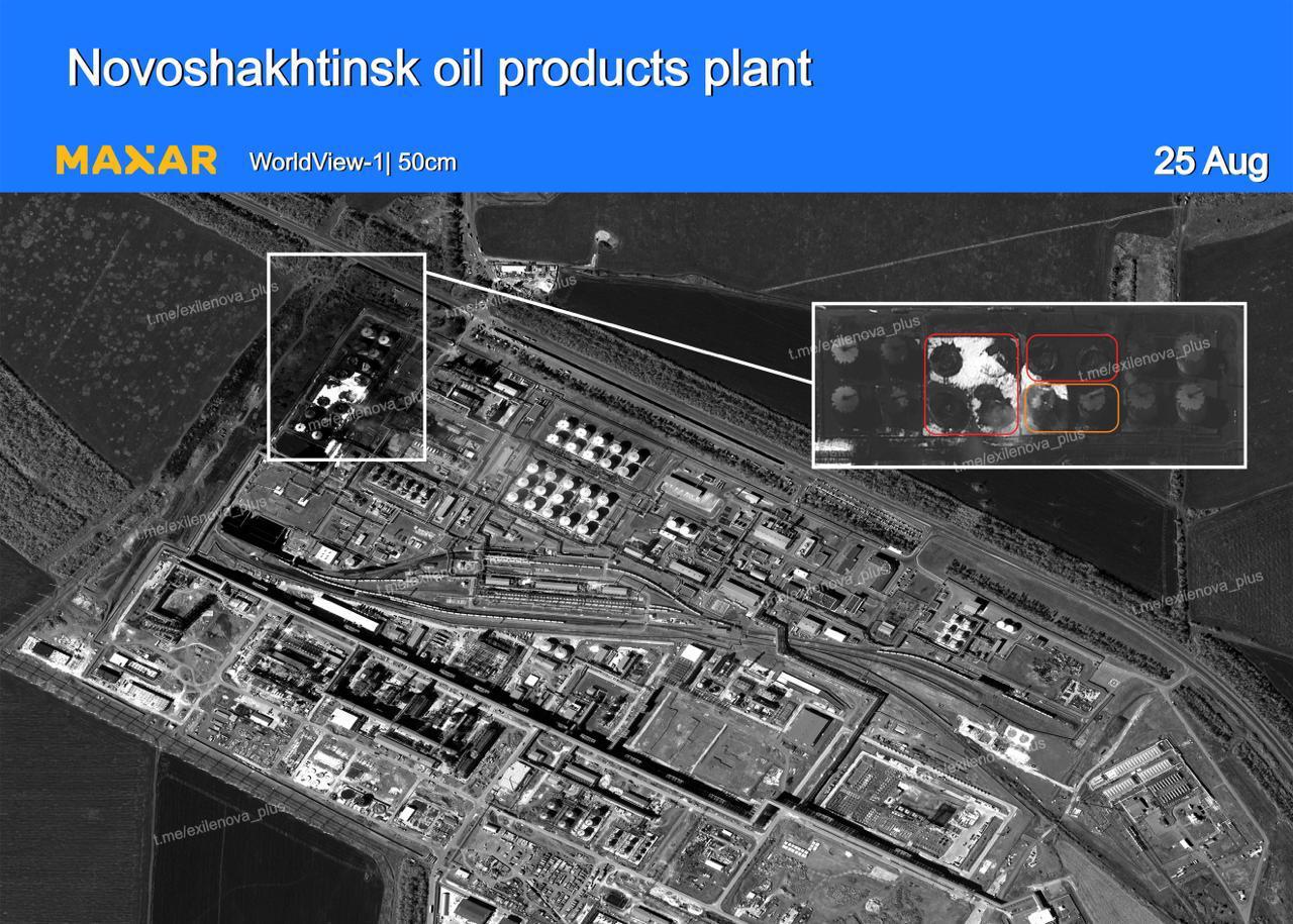 Згідно з супутниковими знімками Maxar, на Новошахтинському НПЗ внаслідок атаки повністю знищені шість резервуарів, ще два – пошкоджені.
