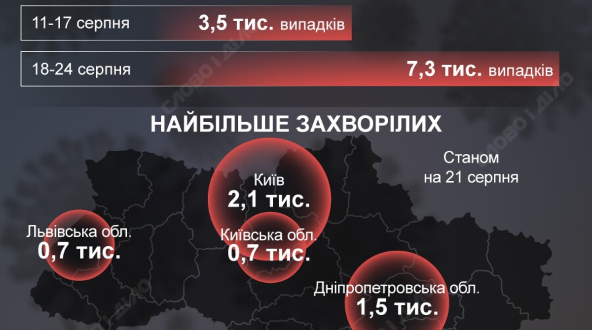 Найбільше хворих на COVID (станом на 21 серпня 2025 року) зафіксували у Києві (2,1 тис. випадків) та у Київській області (0,7 тис. випадків). На другому місці – Дніпропетровська область, там підтвердили 1,5 тис. випадків захворювання. На третьому – Львівщина з 0,7 тис. випадків.