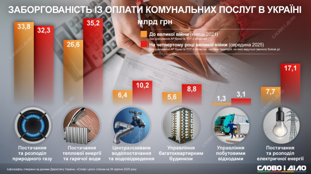 Станом на середину 2025 року борг українців (без урахування жителів Криму та тимчасово окупованих територій чотирьох областей, територій де ведуться або велися бойові дії) зріс наступним чином: за постачання теплової енергії та гарячої води – з 26,6 до 35,2 млрд грн, за централізоване водопостачання та водовідведення – з 6,4 млрд до 10,2 млрд грн, за управління багатоквартирним будинком – з 5,6 до 8,8 млрд грн, за управління побутовими відходами – з 1,3 до 3,1 млрд грн.