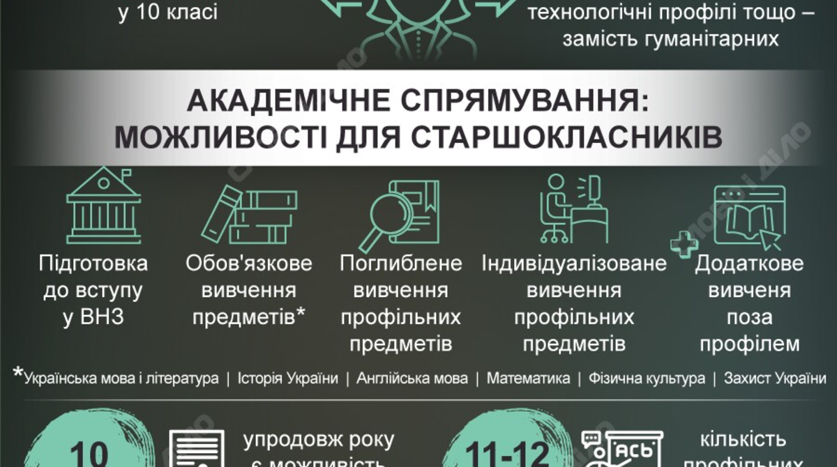- обов'язкове вивчення таких предметів як: українська мова і література, історія України, англійська мова, математика, фізична культура, Захист України.