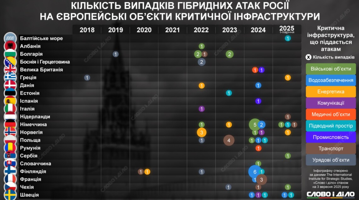 Через втручання у систему GPS літак голови Єврокомісії Урсули фон дер Ляєн зазнав проблем із навігацією. ЗМІ не виключали, що втрутитися могла саме росія, адже в країнах ЄС помітно почастішали гібридні атаки після її повномасштабного вторгнення в Україну. Якщо з 2018 до 2020 року, за підрахунками Міжнародного інституту стратегічних досліджень (IISS), таких інцидентів було лише чотири, то з 2022 до 2025 року кількість гібридних атак сягнула майже 70. Російські спецслужби, які діють за вказівкою Кремля, можуть бути причетними до низки підпалів та вибухів, втручань у вибори, пошкодження підводних кабелів, зокрема у Балтійському морі, збоїв у роботі GPS або хакерських атак на критичну інфраструктуру. На інфографіці «Слово і діло» – гібридні атаки росії за три з половиною роки вторгнення в Україну.
