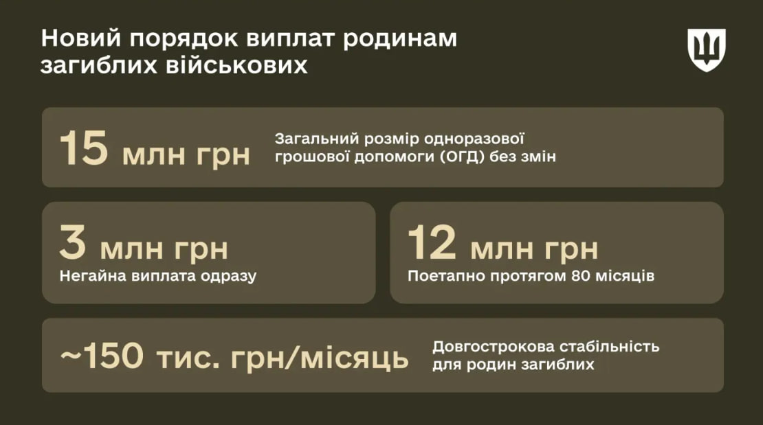 В Україні з вересня змінено порядок виплати одноразової грошової допомоги родинам загиблих військовослужбовців. Згiдно з новими правилами виплата у розмiрi 3 млн грн здійснюватиметься негайно.
