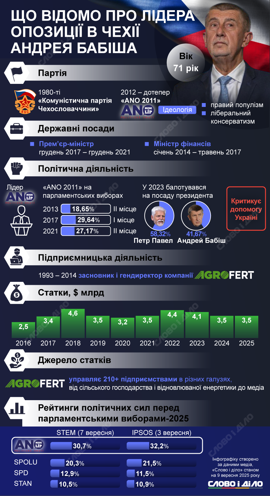 Андрей Бабіш народився 2 вересня 1954 року, нині йому 71 рік. Бабіш не лише політик, але й підприємець, олігарх та медіамагнат. За даними Forbes, він друга людина в Чехії за розмірами статку в країні: з 2014 до 2025 рік його доходи зросли з 2,5 до 3,5 млрд доларів.
